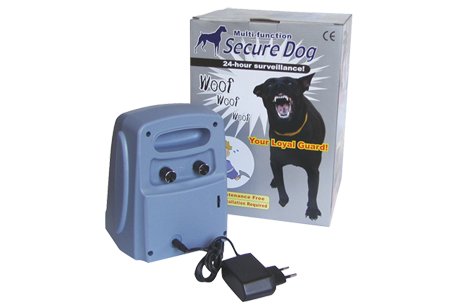 The Secure Dog barking dog alarm system uses an electronic radar wave sense control. This technology allows it to see through virtually any non-metallic barrier. Will not work through metal doors. When an intruder enters the 100 degree triangle of protection, it automatically starts barking like an angry dog. From outside it sounds like a very mean dog inside. It can also announce visitors with a chime or alarm. The radar sensitivity can be adjusted from 10-20 feet. Volume is also adjustable. It also can announce visitors with a melody of birds, frogs and waterfall sounds. These relaxing sounds can also be played whenever you want a soothing background sound. Four settings to choose from: Continual tranquil sounds of the rainforest, Alert sound of an angry and protective watchdog, Soothing rainforest sounds to alert you of a guest's arrival and Alert sounds of both the angry watchdog and a warning siren. * Reliable 24-hour protection * No Installation required * Protection with none of the problems of owning a real dog. * Switches from the watchdog to the tranquil sounds of nature with the simple switch of a button. * Variable distance sensitivity (up to 21') as well as volume control. * Senses movement through walls, doors, and glass to alert you of a visitor's arrival. * Size: 7.5" x 5" x 5.5" * Maintenance free.Available at Amazon This price decline. Quick before it all the time.
